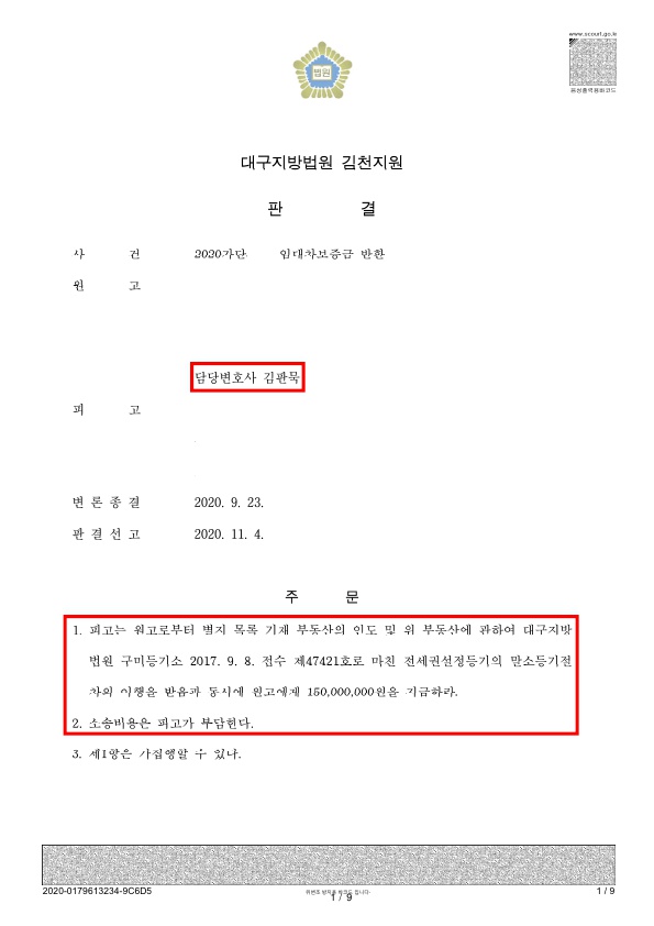 (대구지방법원 김천지원 2020. 11. 4. 선고 2020가단366, 소송수행 김판묵 변호사)