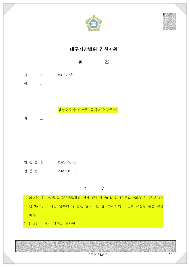 (위 1심 법원의 판단에 양 당사자가 항소하지 않아 확정이 되었습니다.)