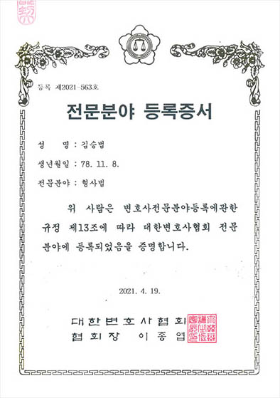 대한변호사협회는 법률수요자의 요구에 적합한 양질의 법률서비스를 제공하고, 회원 상호 간 자유경쟁을 통해 각 업무영역에 대한 전문성을 극대화하기 위하여 변호사 전문분야 등록제도를 시행하고 있습니다.