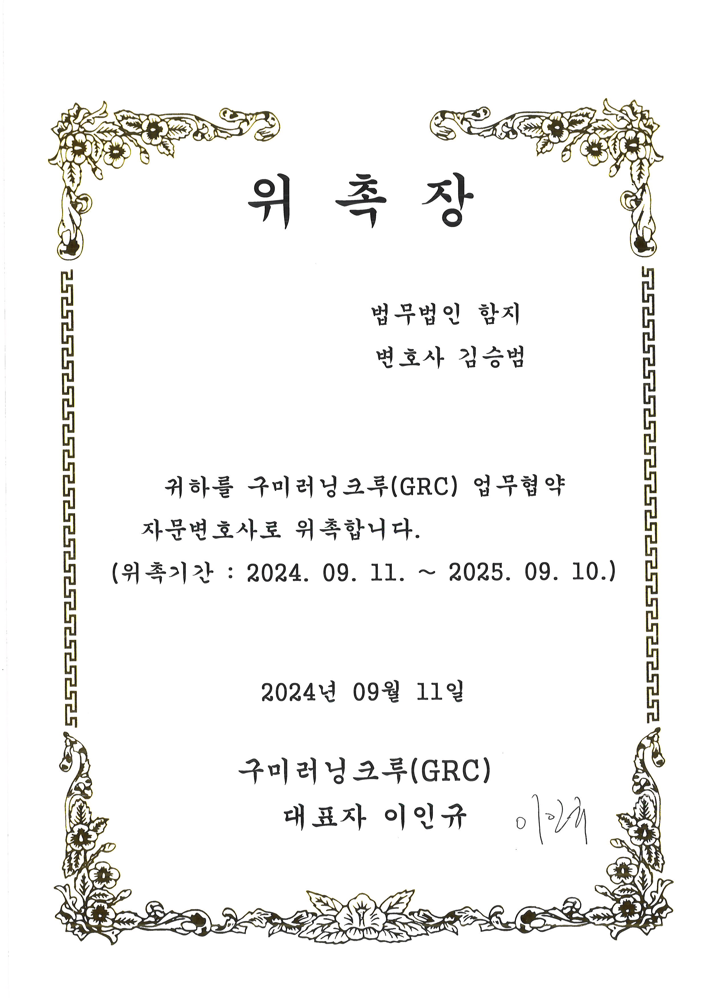 법무법인 함지 김승범 변호사는 2024. 9. 11. 구미러닝크루(GRC)와 업무제휴 협약을 체결하였습니다.