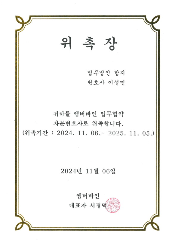 법무법인 함지 이성민 변호사는 2024. 11. 06. 엠버바인과 업무제휴 협악을 체결하였습니다.