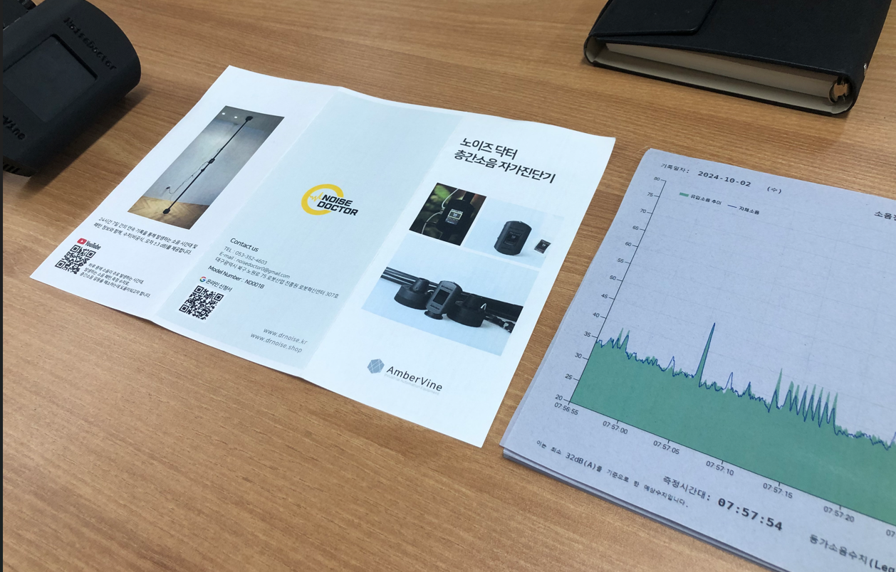 엠버바인은 '노이즈닥터' 라는 층간소음자가진단기를 개발한 업체입니다. 성능인증을 받은 노이즈닥터는 24시간 최장 한 달간의 연속 기록을 통해 발생하는 소음 시간대 및 패턴 정보와 함께, 수치(비공식, 오차 ± 3 db)를 제공합니다.
