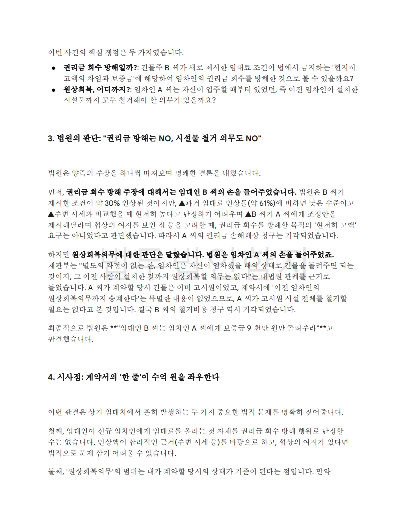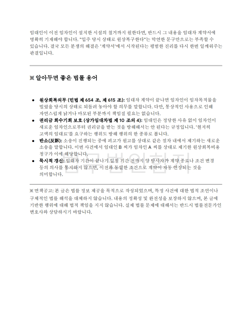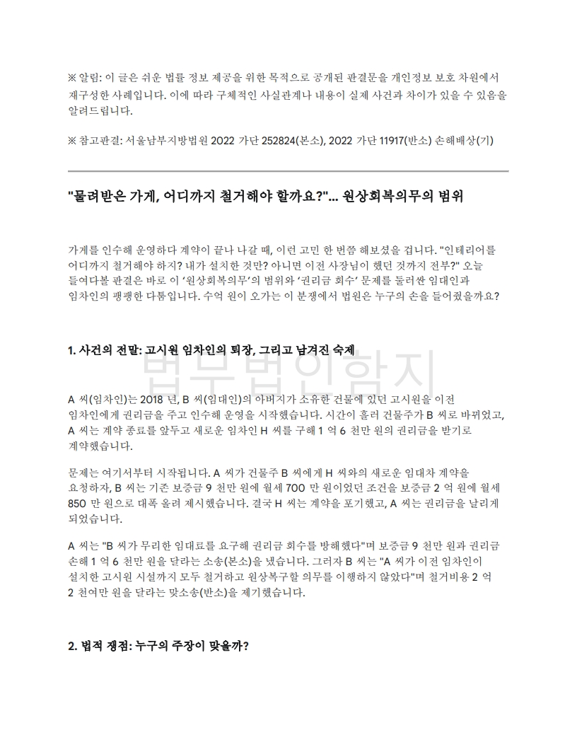 판례로 보는 우리 주변이야기 우리가 일상에서 마주할 수 있는 갈등과 사건들, 법원은 어떻게 판단했을까요?실제 사건과 판결을 통해 우리 삶과 법의 연결고리를 쉽게 풀어드립니다. "물러받은 가게, 어디까지 철거해야 할까요?... 이전 임차인의 흔적까지 지워야 할까? - 원상회복의무의 범위 작성자 sbjunk 작성일 2025-10-28 17:13 조회 33 좋아요 0 싫어요 0 인쇄 « "시세 40억" 믿고 계약한 다가구주택, 보증금 날린 임차인... 법원 "중개사 책임 없다" 밤송이 밟고 '미끌'... 체험농장 주인, 어디까지 책임져야 할까? » 목록보기